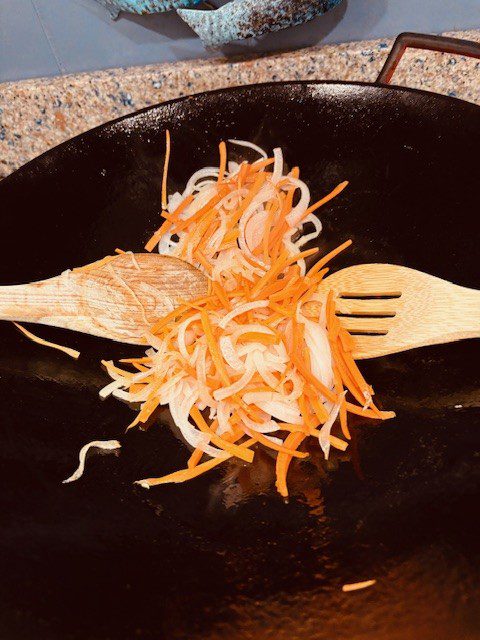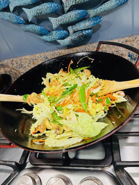 Discard the excess oil in your wok. Heat up the wok again until it is almost smoking. You should have a sheen of oil in the wok. Add the onions and carrots and start to stir fry with a wooden spoon or spatula. Add the garlic and ginger next, stirring constantly so you don't burn them. Add the scallions next. Keep stirring. Add the mushrooms. Stir. Add the snap peas. Add the cabbage. Stir, stir, stir.