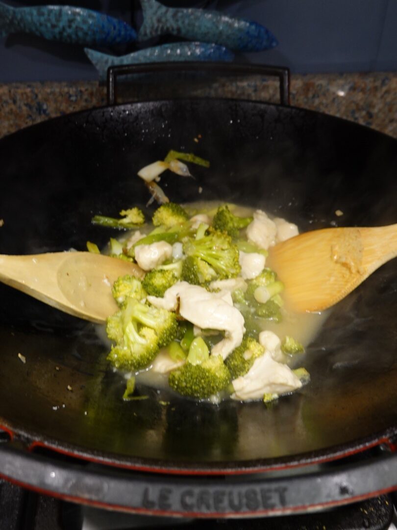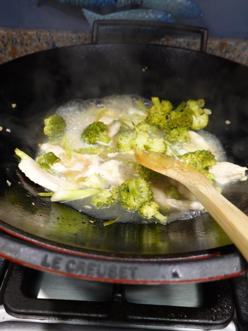 When the garlic has taken on a nice golden color, add the broccoli and chicken. Keep stirring.