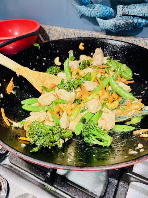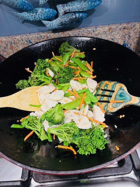 Heat the wok over medium high to high heat. Swirl a little neutral oil in the wok. Fry the garlic and ginger. Add the vegetables. (Maybe drizzle a little sherry down the sides of the wok). Stir, stir, stir!