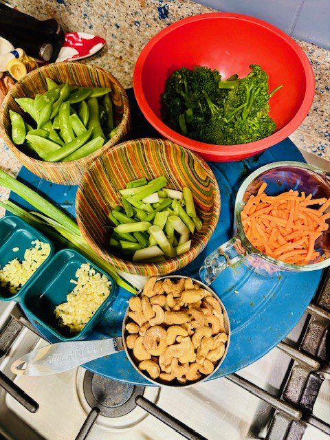 Chop the vegetables: Mince the garlic and ginger, and chop the other vegetables and have everything ready for when you start the stir fry.