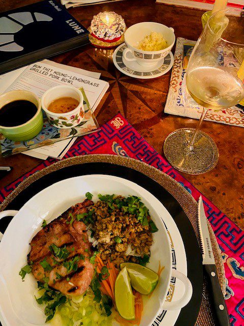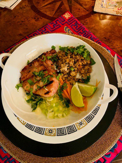 This dish is called Bun Thit Noung in Vietnamese. “Thit” is pronounced without the “h,” and “Noung,” is pronounced, “noong.” Thit NoungĀ meansĀ grilled meat in Vietnamese. It is usually pork that is marinated with lemongrass, garlic, fish sauce, and sugar, and then grilled over charcoal or baked in the oven. It is a popular dish that can be served with rice, noodles, or bread, and often accompanied by fresh herbs, salad, pickled vegetables, and fish sauce dressing. I found this recipe in Jet Li’s 101 Asian Dishes You Need to Cook Before You Die (2017) but I used thin pork loin chops instead of the sliced pork shoulder he recommended, and I grilled the pork on my Big Green Egg instead of searing it on a griddle.Ā I think my alterations to Li’s recipe were a huge improvement.