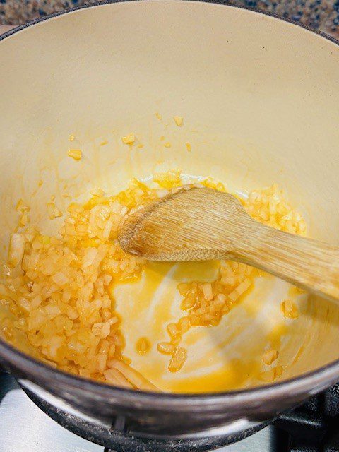 Make the soup: Swirl some chili oil in your soup pot. Saute the onions and garlic over medium heat until just starting to color.