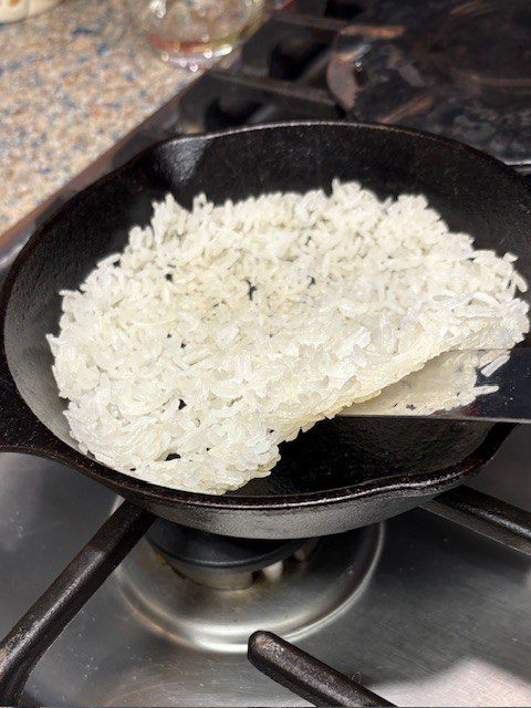 Start your sizzling rice first: Spread a thin layer of left-over cooked white rice in a non-stick skillet. Cook over low heat for half an hour until the rice is lightly browned and pulls away in one piece from the skillet. Flip it over and cook it another half hour. It will be like a thin pancake. When you are just about ready to serve the soup, heat it up because it needs to be really hot in order to sizzle when the soup hits it.