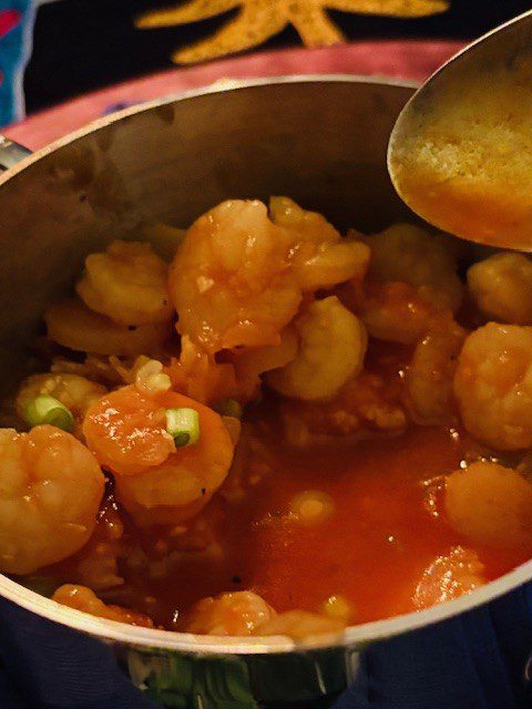 I used "gumbo shrimp," already peeled and deveined at Dorignac's. I also used Campbell's tomato soup -- after you simmer it a while with the onions and garlic, it tastes great.